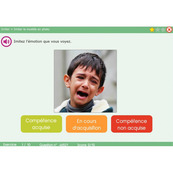 Le logiciel permet de travailer à la fois sur l'expression faciale emotionnelle mais également sur la reconnaissance d'expressions faciales émotionnelles.